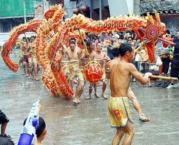 如今已發(fā)展成為對喜慶節(jié)日的慶祝,對美好生活祝福的一種方式。它用鮮棕葉作龍須,用葛藤、黃荊條、松樹枝作龍身,分9節(jié)、11節(jié)、1 3節(jié)、15節(jié)等不同長度的奇數(shù),由9至15人參加舞龍。伴著鑼、鼓、鎖吶的鏗鏘樂曲,一人持“寶”在前,龍舞歡騰時(shí)有“二龍搶寶”、“蛇蛻皮”、“烏龍絞柱”等50多種動作玩法。與此同時(shí),身著民族服裝的群眾用臉盆、水瓢、銻桶等容器端水圍繞著龍潑澆,這樣邊舞邊潑水、水潑得越多龍舞得越歡,也預(yù)祝大家當(dāng)年風(fēng)調(diào)雨順,五谷豐登,其場面歡樂喜慶,風(fēng)趣幽默。已列入我市第一批非物質(zhì)文化遺產(chǎn)保護(hù)名錄。