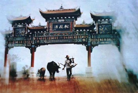 | 一千五百多年前,東晉大詩人陶淵明寫了一篇千古名文《桃花源記》(為其詩《桃花源》之序)。說是武陵地方的一個漁夫,沿著一條小溪航行,忽然看到山中有一個缺口,就丟下船從這缺口里走進去,發(fā)現了另外一個世界。在這個世界里,土地平曠,房屋整齊,人民生活古樸而富裕,男女老少熙熙為樂,看到漁人大吃一驚,紛紛請他回家吃飯飲酒,自稱祖先是為了逃避秦時的戰(zhàn)亂,逃進桃花源來生活。這些人不知道秦以后有過漢朝,漢朝以后又有晉朝。漁人在這桃花源里住了好幾天,想家了,就與他們告別。出了桃花源,以后再去尋找,就找不到了。