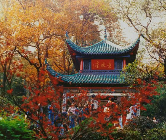 原名紅葉亭,又稱愛楓亭。在岳麓山岳麓書院后清風(fēng)峽的小山上。四周皆楓林,春時(shí)青翠,夏日陰涼,深秋則楓葉紅艷,別有桂趣。亭為清乾隆五十七年(1792年)建,因取唐杜牧“停滯不前車坐愛楓林晚,霜葉紅于二月花”詩(shī)意而名。光緒、宣統(tǒng)年間,湖南高等學(xué)堂臨督程頌萬將張南軒與錢南園游山七律詩(shī)刻于亭中方石上,題名“二南詩(shī)刻”,亭前石柱刻對(duì)聯(lián)曰:“山徑晚紅舒,五百夭桃新種得;峽云深翠滴,一雙馴鶴待籠來,”亭右有清楓橋,下面小溪叫蘭澗,1952年亭又經(jīng)修葺,朱欄藻井,煥然一新,毛澤東題有“愛晚亭”額。