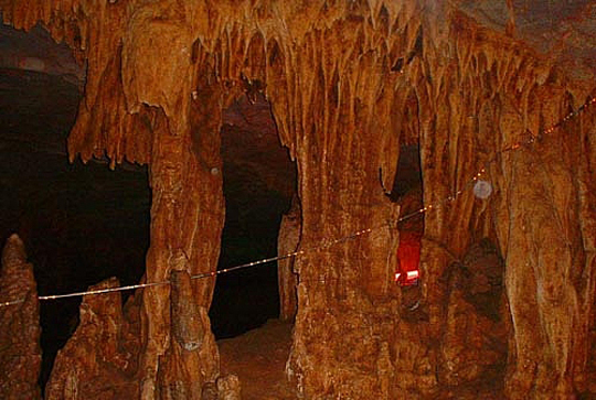 | 藏君洞為一大型天然溶洞,溶洞長(zhǎng)25000米,已探明洞長(zhǎng)4000m,洞內(nèi)洞中有洞、洞中有河,迂回曲折,地下河流水潺潺,溶洞分布在石炭系中、上統(tǒng)碳酸鹽巖中,洞內(nèi)鐘乳石十分豐富:石筍、石柱、石幔、石樓、石像比比皆是。洞內(nèi)構(gòu)造奇特,石鐘乳千姿百態(tài)、絢麗多彩,景觀奇秀,珍品奇絕,是我國(guó)少有的大型碳酸鹽巖巖溶洞穴之一。目前已開發(fā)的4000m洞穴中,由十二個(gè)大的溶洞群構(gòu)成,由洞口往里有護(hù)君堂、惠帝殿、兩重天、南巡廳、不夜城、龍鳳宮、北國(guó)廳、江南廳、江河壩、閱兵場(chǎng)、國(guó)寶廳等溶洞景觀區(qū)。溶洞一般高5~30m,長(zhǎng)60~100m,寬10~20m,面積60~200㎡。十二個(gè)溶洞沿地下河呈串球狀分布,洞與洞之間有巷道(地下河管道)相連,溶洞中景觀十分豐富,仿佛是一個(gè)瑰麗的地下宮殿。如護(hù)君堂內(nèi)有“尚書帽”、“御馬”、“貓頭鷹”、“小羊羔”、“老夫妻”、“天宮浴盆”等景點(diǎn),惠帝殿內(nèi)由“斷劍石”、“龍椅”、“觀音立佛”、“觀音蓮花寶座”等,“蔬果長(zhǎng)廊”中有形似花菜、白菜、絲瓜、茄子、黃瓜等石筍,不夜城內(nèi)有乳白色石鐘乳巖溶坡面,龍鳳宮內(nèi)有石幔、石柱琳瑯滿目及鐘乳石構(gòu)成的似漢白玉“龍鳳石床”、“旭日東升”的浮雕石鐘乳墻、“燈籠群”、“攀龍柱”、“石蓮花”等,國(guó)寶廳巨型石柱等,巷道側(cè)壁唐僧師徒“西天取經(jīng)”壁畫等,景觀類型齊全,是巖溶洞穴中具有典型地學(xué)意義的巖溶地貌景觀,屬國(guó)家級(jí)的地質(zhì)遺跡景觀。