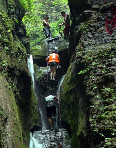 坐龍峽風(fēng)景區(qū) 坐龍峽擁有中國第一條特種游道。所有游道均建于峽谷深處,依山取勢,既經(jīng)細(xì)心雕琢聽卻又渾然天成。粗樸的板栗木棧道,可以讓你零距離的親近那一潭碧幽、聽聞山泉叮咚;精巧的跳墩,可以讓你媳戲流泉、觸感溪瀑;原質(zhì)的石坎道,讓你不得不調(diào)動(dòng)全部的身心能量悉心攀援、感悟峽谷;有驚無險(xiǎn)的鐵梯,讓你伴著腳下轟鳴的溪水,在驚怵中體味一份快慰。出口處的土家山寨,保留了古樸獨(dú)特的生活習(xí)俗。一塊臘肉就一口醇香的“苞谷燒”會(huì)讓你洗去所有的疲憊,在輕松中憨厚的主人向你講述過去強(qiáng)人出沒的故事......