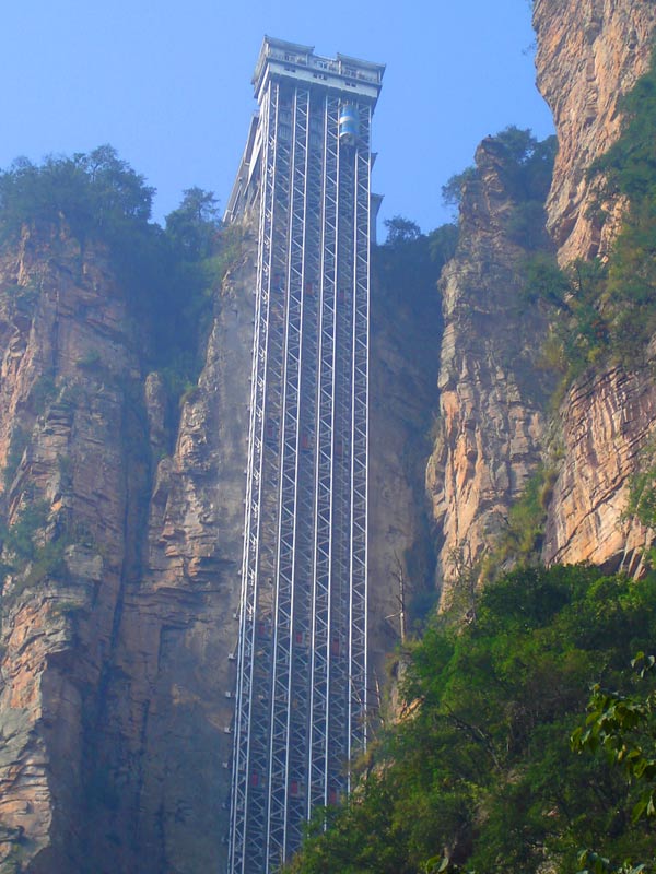 百龍?zhí)焯,垂直高?35米,運行高度326米,由154米山體內堅井和172米貼山鋼結構井架等組成,采用三臺雙層全暴露觀光電梯并列分體運行,每臺次載客50人次,運行速度3米/秒,三臺同時運行每小時往返量達4000人次。百龍?zhí)焯莸男藿▽崿F“山上游,山下住”的目標,提供了交通保障,將袁家界天下第一橋、迷魂臺、天懸白練以及烏龍寨、楊家界等絕世美景從幕后推向了前臺,并將天子山、袁家界、金鞭溪等精品旅游線路連為一體,解決了多年困擾景區(qū)的交通瓶頸問題。
