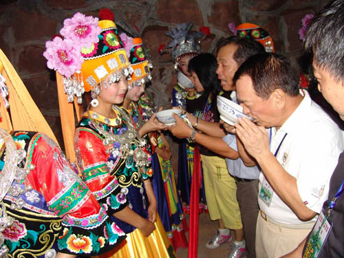 祝賀詞和答謝詞之后,主人把早已想好了的農(nóng)事或家事其日常生活的要事向來客提問,接謝人隨問隨答,然后由族長(zhǎng)十分恭敬地雙手舉起盛滿包谷酒的酒杯,遞給一個(gè)年長(zhǎng)客人,一碗一碗地讓客人們喝下這香醇美的包谷燒酒。一切儀式做完之后,說聲:“得罪了,最尊貴的客人”,客人答一聲“請(qǐng)不要客氣,我們都是一家人”。這時(shí),酒門大開,攔門人很禮貌地讓開一條道路恭迎客人進(jìn)屋。