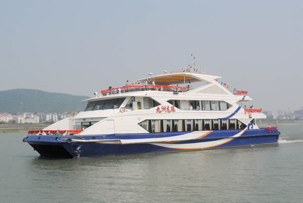 九洲龍?bào)J豪華游船船長(zhǎng)42米,寬12米,擁有280個(gè)客位,游輪采用了國(guó)際先進(jìn)的造船技術(shù),流線型的外觀設(shè)計(jì)、造型典雅時(shí)尚。船身共分為3層,可滿足游客餐飲、觀光、娛樂(lè)、會(huì)務(wù)等多種需求。