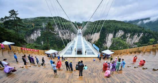 作為目前世界最高、最長人行玻璃天橋,張家界大峽谷玻璃橋創(chuàng)下了十項“世界之最”,堪稱國際橋梁建設(shè)的典范。其橋面由99塊全透明玻璃鋪設(shè),遠看玻璃橋薄如蟬翼,“隱形”于山水天際之中,橋面總長430米、寬6米,距谷底相對高度約300米,游客走在橋上就可以清楚地看到腳下的懸崖峭壁,好似行在空中,非常刺激。