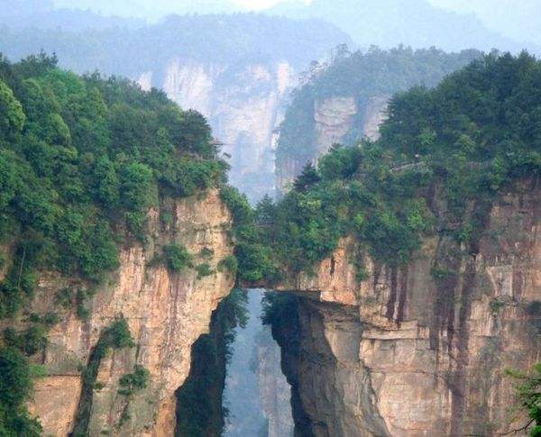 “后花園”至天下第一橋,有一條全長2000多米的游道,路面多為白色的條石鋪成,站在遠(yuǎn)處觀望,很像一條白色的綢帶打了兩個(gè)結(jié),一頭系在“迷魂臺”,一頭第在“天下第一橋”。信步漫游,沿途可欣賞到“拜仙臺”、“百丈絕壁”、“小洞天”、“情人谷”等別有情趣的景點(diǎn),這里海拔不高,一般不受氣候影響,慢慢品味,定會使您賞心悅目!疤煜碌谝粯颉笔菑埣医纭笆蠼^景”之一。也是袁家界的標(biāo)志性景點(diǎn),它是居于兩山之間形成的一座天然石橋,而兩山原為一體,橋身是兩山相連的關(guān)鍵部分,但因中間石質(zhì)較為薄弱,由于風(fēng)化、崩塌作用的影響,又經(jīng)過日曬雨淋、流水洗刷、山洪沖擊,久而久之,終于形成今天這一特別的奇景……。自杉刀溝上袁家界,沿絕壁頂部邊緣遨游,至于中坪“觀橋臺” 遙望千米之外,只見一天然石橋凌空飛架兩峰之巔,氣勢磅礴,奇?zhèn)ソ^倫,被稱為“天下第一橋”。石橋?qū)拑H3米,厚5米,跨度約50米,相對高度近400米。天下第一橋與夫妻巖并稱“張家界雙絕”!疤煜碌谝粯颉睒蛎鎸拑擅,厚四米,跨度為二十多米,高度為三百多米,是世界是迄今為止所發(fā)現(xiàn)落差最高的天然石橋。