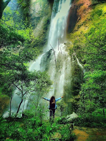 杉刀溝盡頭,有一抹泉水從200多米高的崖頂飄然而下,仿佛一匹白色長練自天而降。飛瀑下臨深潭,綠水泱泱,水霧漫漫,睛雨交加之日,時(shí)有彩虹飛升。每當(dāng)山洪瀑發(fā),瀑布猶如一巨龍,飛騰傾瀉,聲若巨雷,蔚為壯觀。