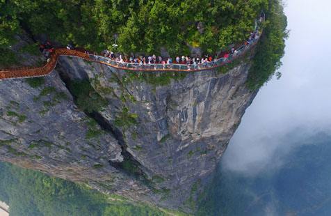 站在棧道上俯瞰群山,古人“會當(dāng)凌絕頂,一覽眾山小”的感覺油然而生。由于天門山是國家森林公園,植被特別豐富,加上典型的喀斯特地貌,所以,在這條棧道上更能找到一種在乘坐直升飛機(jī)飛越熱帶雨林大峽谷的感覺,這平時(shí)只能在電影里看到的場景,在這里能讓你身臨其境。